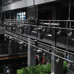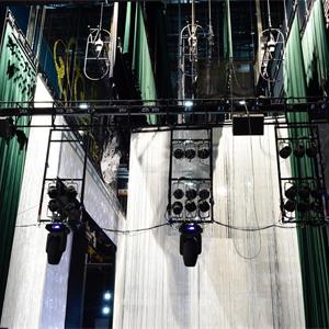 在燈架下沿,每側(cè)配若干套“日”字型燈光排架,用于懸掛燈具,燈光排架可手動使之在垂直臺口方向移動,燈架可整體升降。燈光排架可根據(jù)需要上下疊加。也有用雙層燈光吊桿桿體硬聯(lián)接組成的掛燈結(jié)構。