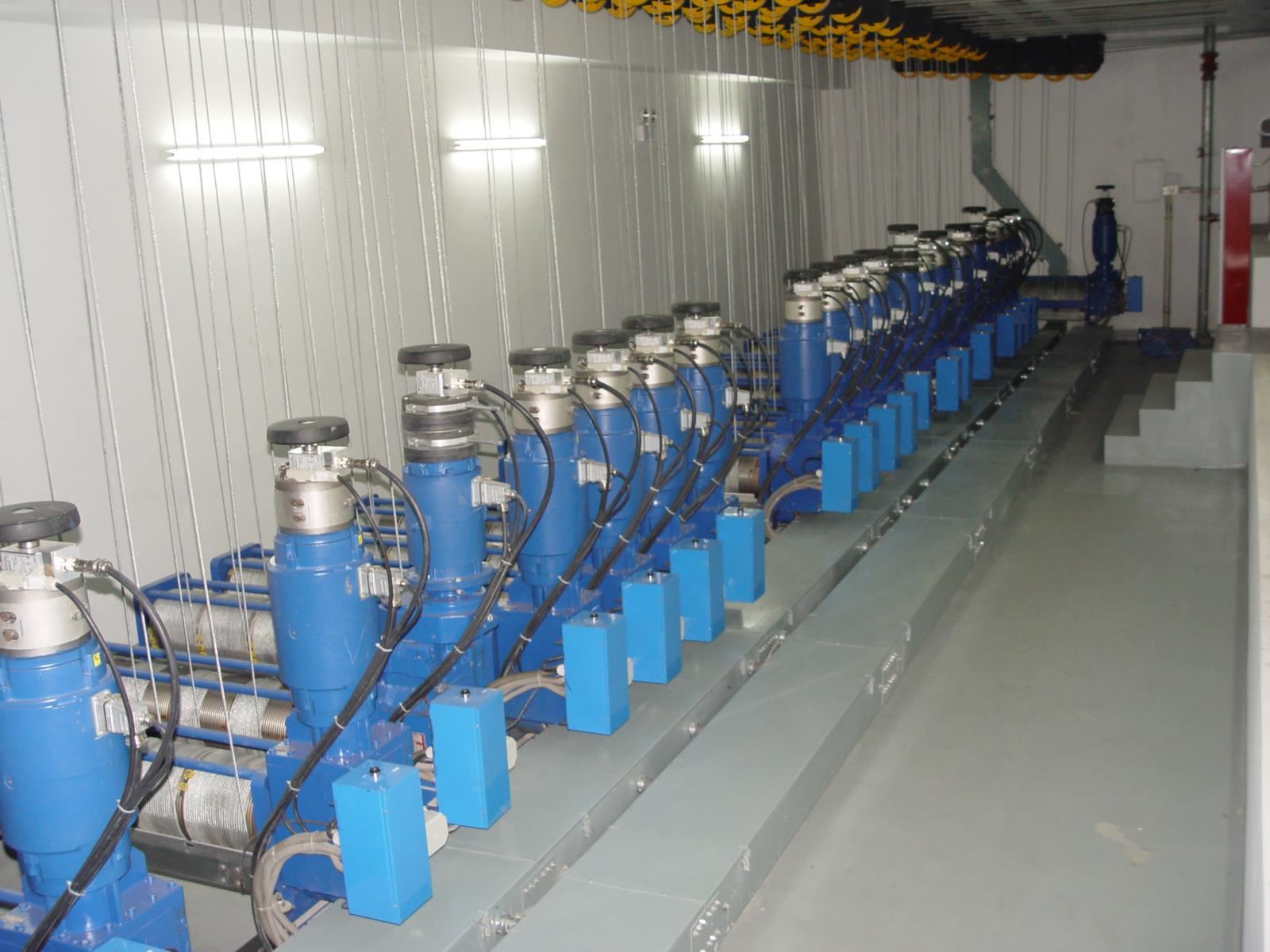 卷揚(yáng)系統(tǒng):包括電動(dòng)機(jī)、減速器、雙制動(dòng)器、卷筒、滑輪組件、鋼絲繩和配件、輔助操作手輪等。滑輪組件(一般)包括拐角滑輪、吊點(diǎn)滑輪。