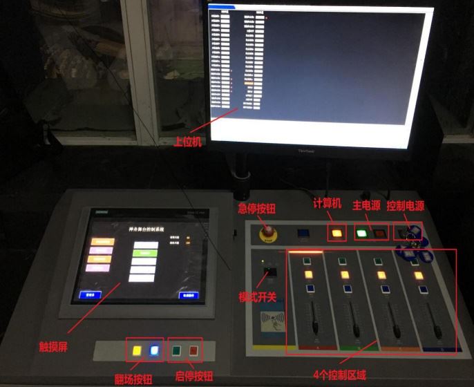 一般包括:臺(tái)上舞臺(tái)機(jī)械控制系統(tǒng)和臺(tái)下舞臺(tái)機(jī)械控制系統(tǒng)。臺(tái)上舞臺(tái)控制系統(tǒng)由控制室內(nèi)的主控制臺(tái)柜和便攜式操作臺(tái)組成;臺(tái)下舞臺(tái)控制系統(tǒng)由控制室內(nèi)的主控制臺(tái)柜和便攜式操作臺(tái)組成??刂婆_(tái)柜主要包括上位機(jī)(IPC)和下位機(jī)(PLC)兩部分,具備自動(dòng)和手動(dòng)控制功能。