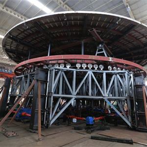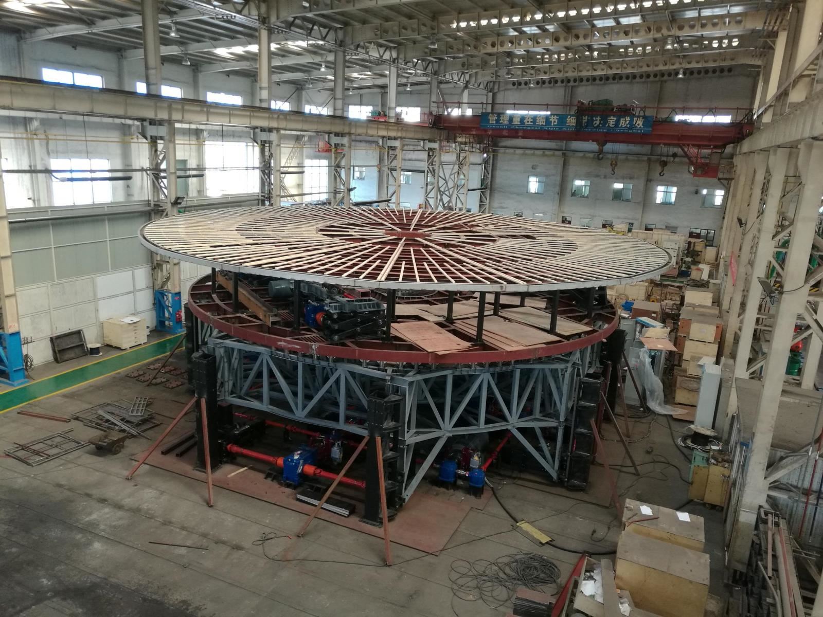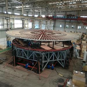舞臺升降機(jī)是節(jié)目(秀)的一個重要布景元素,為單層結(jié)構(gòu),行程: -5.60m至 -3.60m,總行程為2.0m。舞臺升降機(jī)的頂面將沿著單一軸線從水平位置傾斜10度。整個頂面可以連續(xù)旋轉(zhuǎn)。升降機(jī)可提供持續(xù)的電源,升降機(jī)下方配備工作照明。所有配電線路在升降機(jī)框架內(nèi)的導(dǎo)管中運行。升降機(jī)的頂面為防漏不銹鋼底盤。底盤向中心填充點傾斜 10mm/m;外加8mm的地板表面材料,結(jié)合至 25mm PVC 板材。底盤外緣是一個連續(xù)的環(huán)形溢流排水口。圍繞舞臺升降機(jī)是一個環(huán)形無邊水效果。在周邊平臺盤中有非吸水性地板材料,坡度也是 12mm/m,與舞臺升降機(jī)相配。