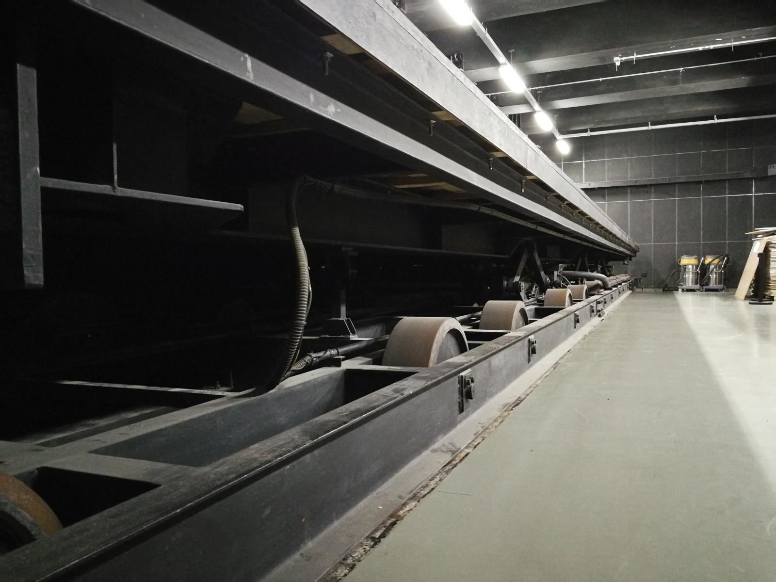 芭蕾舞車臺由安裝在鋼架的支撐輪和2個齒輪架上(齒條驅(qū)動時)的鋼結(jié)構(gòu)桁架組成。外部驅(qū)動裝置隱藏在芭蕾舞車臺臺體和主升降臺臺面之下。與臺車下部的齒條嚙合,向臺車傳送動力。由設(shè)置在第三、四塊主升降臺上的驅(qū)動裝置通過接力技術(shù)完成整個行程驅(qū)動?;蚩捎呻妱幽Σ凛喬峁┬凶邉恿Α?/p>