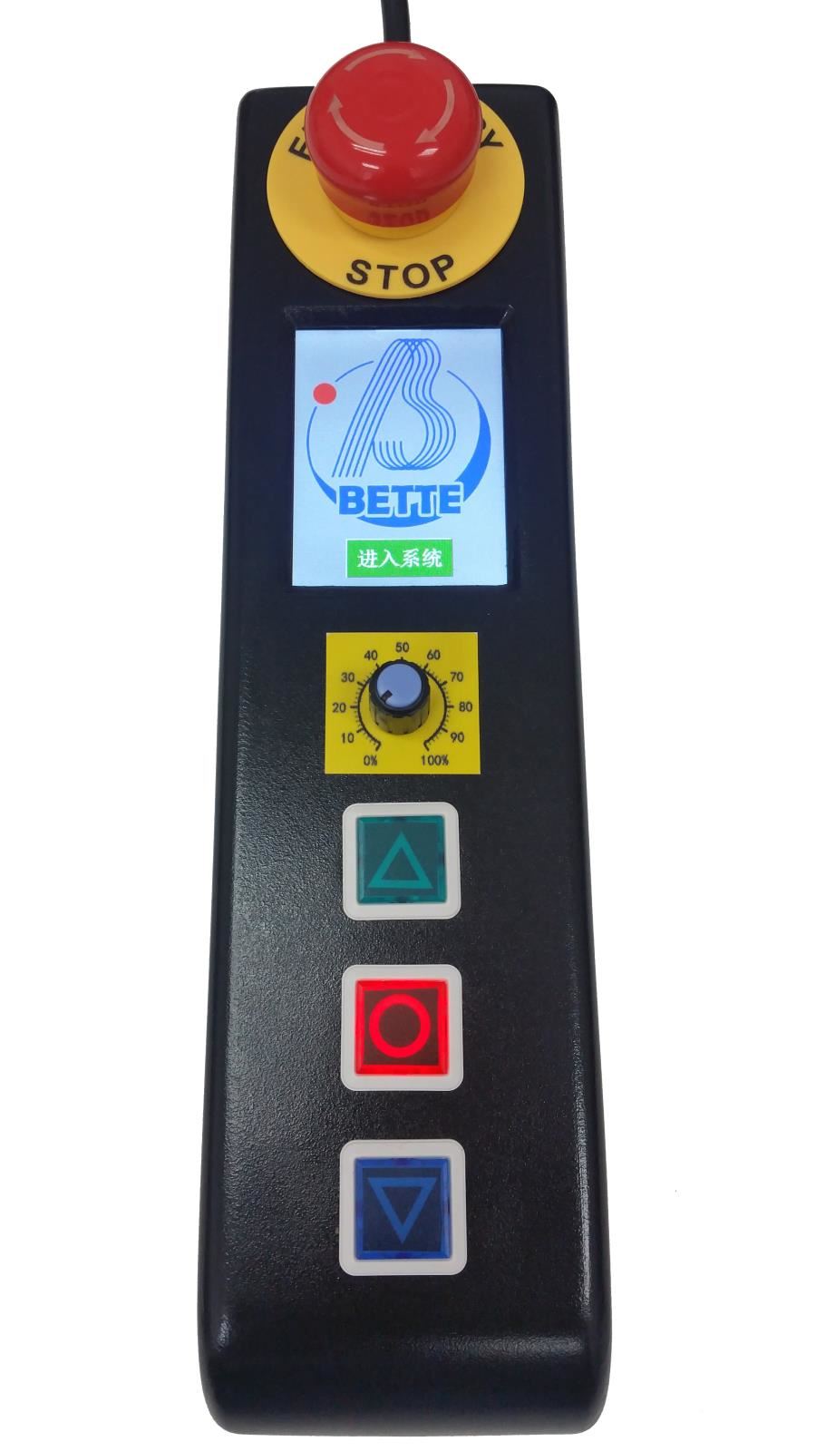 近控盒上裝有“緊急停止按鈕”,與主控制系統(tǒng)的急停鏈做串聯(lián)處理,在遇有無法正常停車的情況時,可以拍下此按鈕,切斷主控制系統(tǒng)的三相供電,待排除了意外情況之后再予以恢復(fù)。