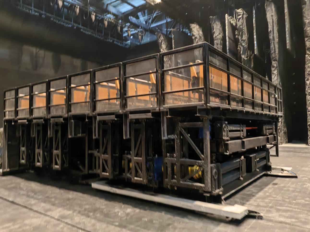 沉浸運(yùn)動(dòng)式觀賞座椅臺(tái)為“淺基坑大行程”類型設(shè)備,采用多級(jí)升降機(jī)構(gòu),可升降和行走。升降單元共分8個(gè)子單元臺(tái)階,